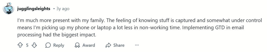 "That's very helpful! Your take on GTD helps me taking of the pressure on getting it right and focus more on getting things done! Keep up with the good work!"